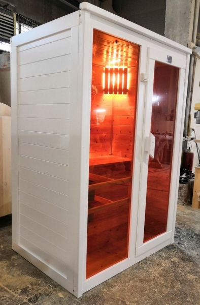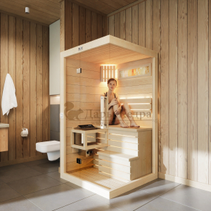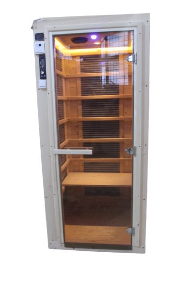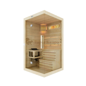 Это специально оборудованная готовая деревянная кабина для сухого и влажного парения. Электропечь нагревает пространство внутри и позволяет сбрызгивать камни водой, слегка увлажняя воздух. Такая процедура позволяет избежать перегрева. Каркас сауны выполнен из массива кедра, снаружи и внутри обшит липовой вагонкой сорта «Экстра» и имеет теплоизоляционный слой. Также двухуровневый полок идёт из кедра для обогащения внутри кабины полезными фитонцидами, а в сочетании с противовирусными свойствами липы сауна становится настоящим источником здоровья.