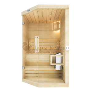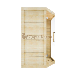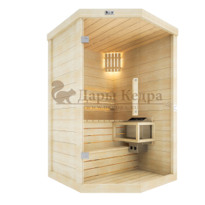 Это специально оборудованная готовая деревянная кабина для сухого и влажного парения. Электропечь нагревает пространство внутри и позволяет сбрызгивать камни водой, слегка увлажняя воздух. Такая процедура позволяет избежать перегрева. Каркас сауны выполнен из массива кедра, снаружи и внутри обшит липовой вагонкой сорта «Экстра» и имеет теплоизоляционный слой. Также двухуровневый полок идёт из кедра для обогащения внутри кабины полезными фитонцидами, а в сочетании с противовирусными свойствами липы сауна становится настоящим источником здоровья.